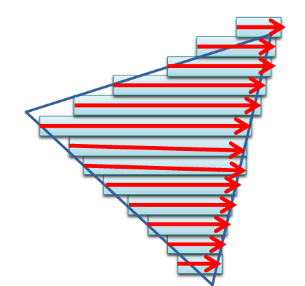 어떻게 해야 삼각 폴리곤을 효율적으로 그릴 수 있을까? 3D 그래픽에 사용하는 삼각 폴리곤은 3개의 변뿐만 아니라 삼각형의 내부 면도 전부 그려야 한다. 이런 도형을 효율적으로 그리려면 스캔 라인 알고리즘으로 그리면 된다. 삼각형을 세로로 한 줄씩 나누고 가로 일직선으로 분해한 후 그 선분을 위에서부터 차례대로 그리는 것이다.