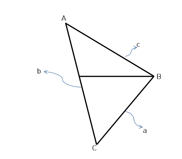 꼭짓점 1, 2, 3을 A, B, C라고 하고 마주 보는 대변을 a, b, c라고 한다.